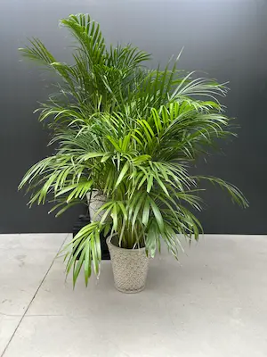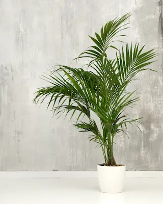 Palmera elegante y de crecimiento lento, muy utilizada en interiores amplios. Considerada no tóxica para mascotas y una de las palmeras más seguras para hogares con perros y gatos. Su porte natural la hace fácil de integrar en espacios compartidos.