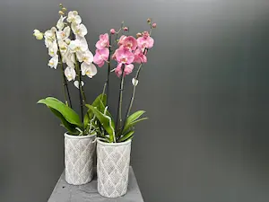 Orquídea muy apreciada por su elegancia y la larga duración de sus flores. Está considerada no tóxica y es una opción segura para hogares con mascotas.