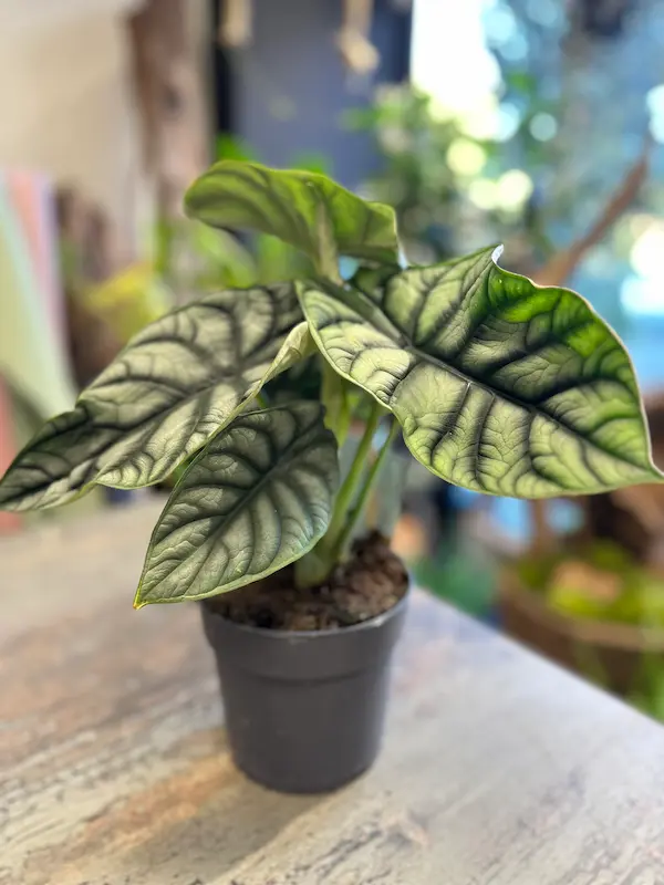 Alocasia baginda ‘Silver Dragon’: con su textura metálica y nervaduras plateadas, parece un auténtico dragón que se ha transformado en planta. Además, su brillo plateado bajo la luz tenue es hipnótico.