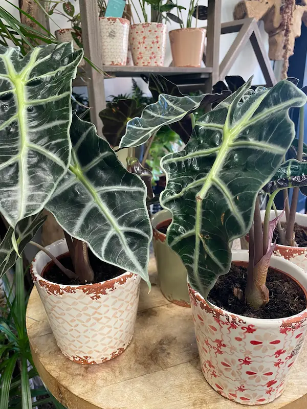 Alocasia sanderiana: una planta de presencia majestuosa y alma tropical. Sus hojas en forma de lanza, con bordes afilados y nervaduras plateadas, parecen esculpidas por un artista. Su porte elegante y exótico recuerda a los jardines secretos de antiguos templos perdidos en la selva, donde cada hoja guarda un misterio. Ideal para quienes buscan una belleza singular y poderosa.