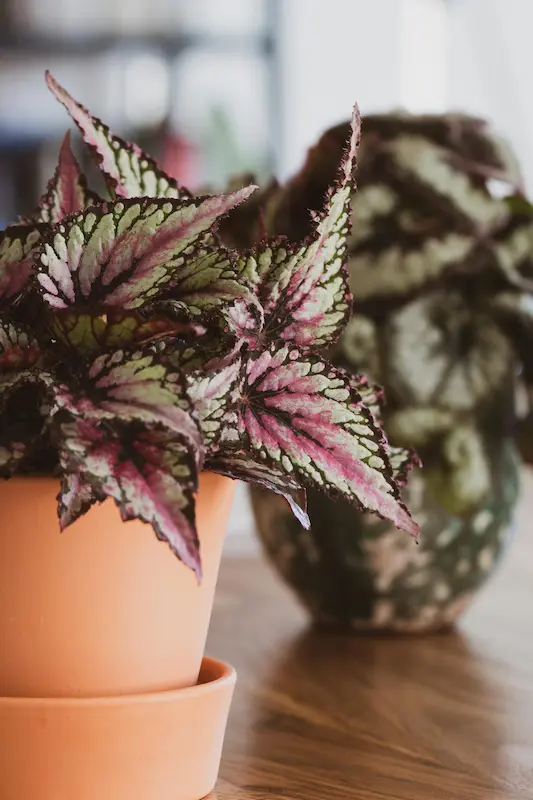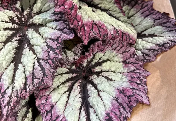 Begonia rex: si existe una planta mágica, es esta. Sus hojas combinan púrpura, rosa, plata y negro en un patrón digno de una poción encantada. Cada hoja es una pequeña obra de arte.