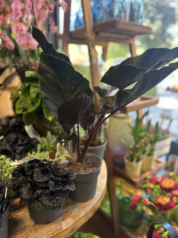 Alocasia Antoro Velvet: sus hojas oscuras y aterciopeladas, con nervaduras plateadas, parecen haber sido diseñadas en un laboratorio de magia. Su textura suave y su color negro profundo le dan una presencia hipnótica, casi mística. Es una planta que impone respeto, atrae miradas y seduce a los amantes del dramatismo vegetal y las especies exóticas.
