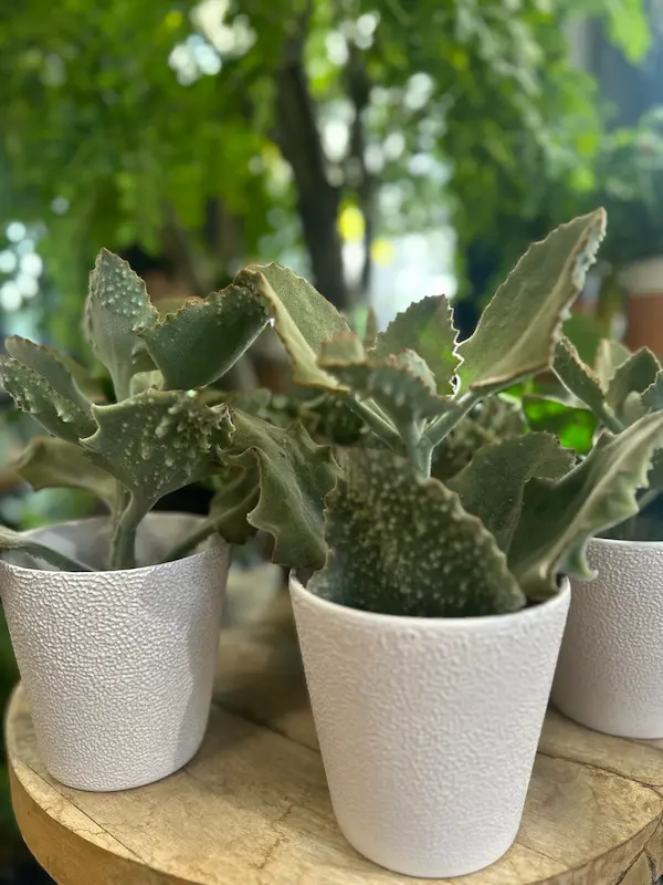 Kalanchoe beharensis: aterciopelada, con hojas gruesas y dentadas, parece salida de otro planeta. Su textura casi animal y su color gris verdoso la hacen irresistible.