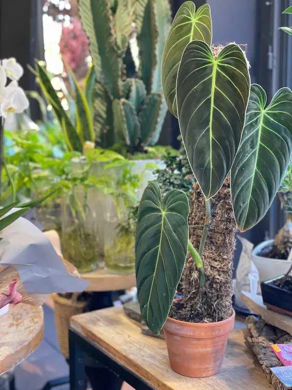 Philodendron melanochrysum: una de las más deseadas por los coleccionistas. Sus hojas alargadas, oscuras y de tacto aterciopelado reflejan la luz como si fueran seda negra. Es pura elegancia tropical con un toque misterioso.